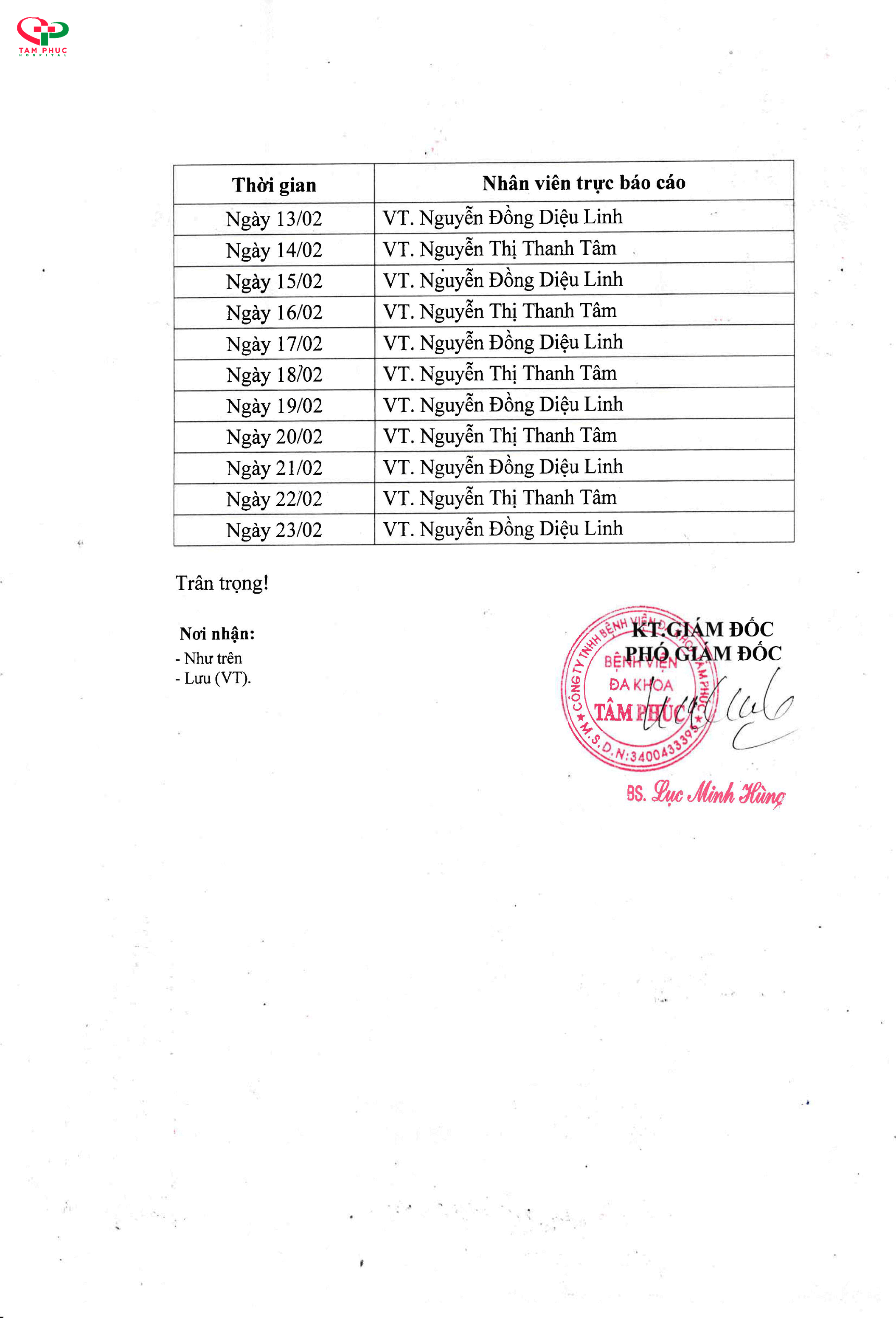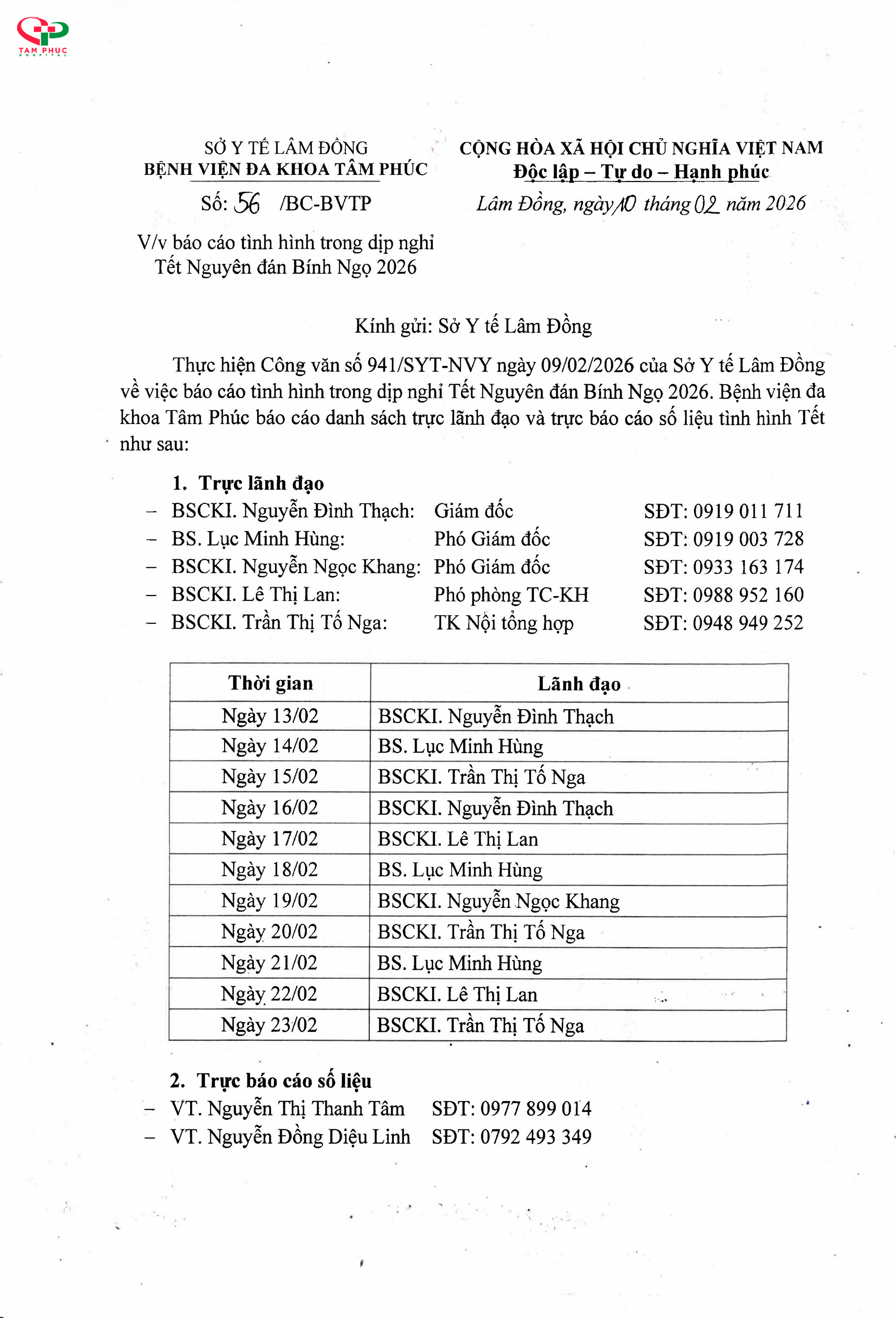 Danh sách trực Lãnh đạo và trực báo cáo số liệu Tết 2026